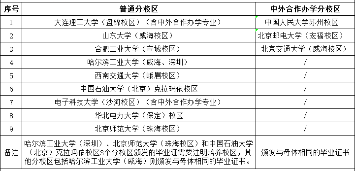 在高考志愿填报时,我们常看到的是大学、学院、独立院校、中外合作办学、XX大学XX“校区”、“分校”等等字眼,但是很多考生和家长对其含义和区别并不能有效甄别和理解,特别是对于XX大学XX“校区”、“分校”,容易被考生和家长混淆。“分校区”和“分校”,其实二者并不是一个概念。严格意义上讲,“分校区”大多是指与“本校”除地理区位不同外其余方面皆保持一致的“本校分部”,在各方面都直接受“本部”领导。而“分校”大多是与“本校”在教学管理方面相独立的办学机构,但是,无论是“分校区”还是“分校”其共同特征是都具备独立的招生院校代码。 一、分校区 依据其办学内容又分为普通分校区和中外合作办学分校区,其中: A、普通分校区 包括大连理工大学盘锦校区、山东大学(威海)、合肥工业大学(宣城校区)、西南交通大学峨眉校区、哈尔滨工业大学(威海、深圳)、中国石油大学(北京)克拉玛依校区、电子科技大学(沙河校区)、华北电力大学(保定)校区和北京师范大学(珠海校区)等9所。 需要特别说明的是:哈尔滨工业大学(深圳)、北京师范大学(珠海校区)和中国石油大学(北京)克拉玛依校区3个分校区颁发的毕业证会注明培养校区,其他分校区包括哈尔滨工业大学(威海)则颁发与母体相同的毕业证书。 (一)大连理工大学(盘锦校区) 1、学校属性:“985工程”、“211工程” 4、校址:辽宁省盘锦市辽东湾新区 (二)山东大学(威海) 1、学校属性:“985工程”、“211工程” 2、和主体学校的关系:山东大学是教育部直属、列入国家“211工程”、“985工程”和世界一流大学建设高校(A类)重点建设的高校。学校规模宏大,实力雄厚。总占地面积8000余亩(含青岛校区约3000亩),形成了一校三地(济南、威海、青岛)的办学格局。 3、文凭:山东大学(威海)与山东大学各个校区级别相同。校本部和青岛校区为同一本科招生院校代码(10422),威海校区拥有独立的本科招生院校代码(19422),考生填报志愿时分别填报,分别录取。学生在规定的年限内达到所在专业毕业要求,即可由山东大学颁发统一的山东大学本科毕业证书;符合学校学位授予有关规定者,颁发普通高等教育本科毕业生学士学位证书。 (三)合肥工业大学(宣城校区) 1、学校属性:“211工程” (四)西南交通大学峨眉校区 1、学校属性:“211工程” (五)哈尔滨工业大学(威海、深圳) 1、学校属性:“985工程”、“211工程” 2、和主体学校的关系:哈尔滨工业大学(简称哈工大)隶属于工业和信息化部,是首批进入国家“211工程”、“985工程”重点建设的大学,中国“C9联盟”高校成员。2017年入选国家“双一流”建设A类高校。 4、校址: 威海校区山东省威海市文化西路2号; 深圳校区广东省深圳市南山区西丽深圳大学城。 (六)中国石油大学(北京)克拉玛依校区 1、学校属性:“211工程” 3、文凭:中国石油大学(北京)校本部招收的本科生,在规定的年限内达到所在专业毕业要求者,颁发中国石油大学(北京)本科毕业证书;克拉玛依校区招收的本科生,在规定的年限内达到所在专业毕业要求者,颁发中国石油大学(北京)本科毕业证书,标注克拉玛依校区。符合学校学位授予有关规定者,颁发中国石油大学(北京)学士学位证书。 4、校址:新疆克拉玛依市克拉玛依区安定路355号 (七)电子科技大学(沙河校区) 1、学校属性:“985工程”、“211工程” 3、文凭:无论是清水河校区还是沙河校区所录取的考生,毕业时所颁发毕业证书和学士学位证书的学校名称均为电子科技大学,证书种类均为普通高等教育毕业证书。 电子信息类(中外合作办学)相关专业为中外合作办学类专业,只录取填报有该类专业志愿的考生;毕业时颁发电子科技大学相应专业毕业证书、工学学士学位证书以及英国格拉斯哥大学相应学位证书。 (八)华北电力大学(保定)校区 1、学校属性:“211工程” (九)北京师范大学(珠海校区) 1、学校属性:“985工程”、“211工程” 4、校址:广东省珠海市唐家湾金凤路18号 B、中外合作办学分校区 包括中国人民大学(苏州校区)、北京邮电大学(宏福校区)和北京交通大学威海校区等3所。其颁发与母体相同的毕业证书。 (一)中国人民大学苏州校区 1、学校属性:“985工程”、“211工程” (二)北京邮电大学(宏福校区) 1、学校属性:“211工程” 3、文凭:经教育部批准,北京邮电大学中外合作办学专业(电信工程及管理、电子商务及法律、物联网工程三个专业)以“北京邮电大学(宏福校区)”的名称在本科一批招生,颁发学校名称为“北京邮电大学”的普通高等学校本科毕业证书;获得毕业证书且符合国家和学校学位授予有关规定者,颁发北京邮电大学全日制普通高等教育学士学位证书以及英国伦敦玛丽女王大学学士学位证书。成绩达到要求且本人有意者,可直接进入伦敦大学玛丽女王学院攻读更高一级学位;成绩优秀者亦可按北京邮电大学规定,获得直读硕士研究生的推荐权。 (三)北京交通大学威海校区 1、学校属性:“211工程” 4、校址:威海市南海新区现代路69号 附:“985工程”、“211工程”分校区统计表 二、分校 “985工程”与“211工程”大学的分校仅有以下2所(北京师范大学珠海分校是独立学院,不包括在内): (一)东北大学秦皇岛分校 1、学校属性:“985工程”、“211工程” (二)厦门大学马来西亚分校 1、学校属性:“985工程”、“211工