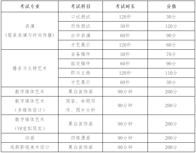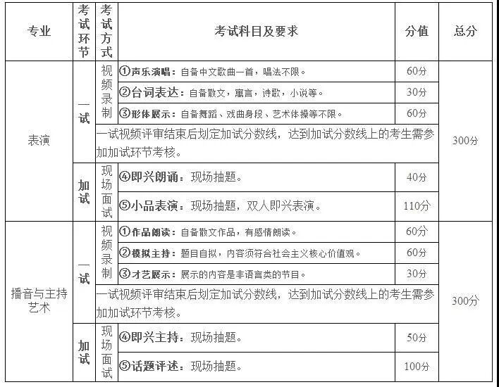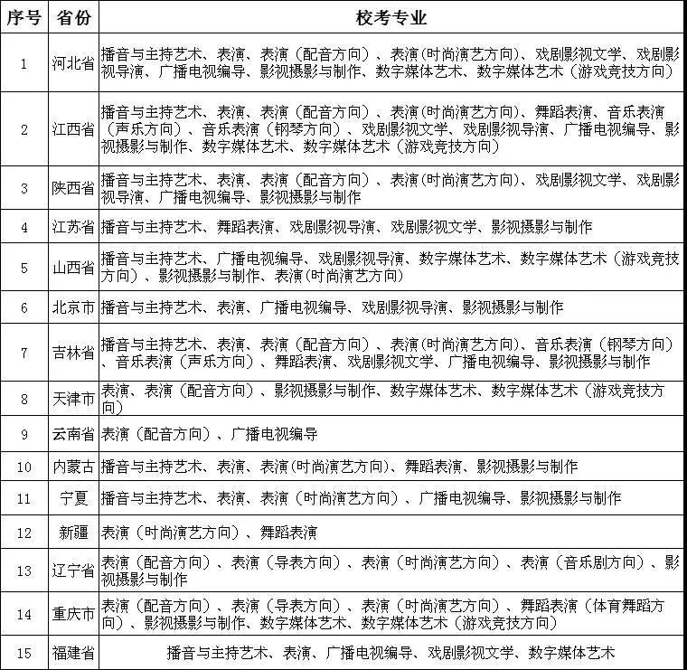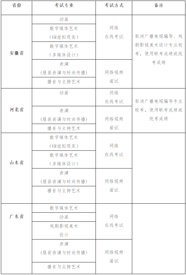 2020省外艺术类校考专业考试办法 2020年,受新冠肺炎疫情影响,我校年后考试的各考点校考报名及考试时间推迟,为贯彻落实教育部“2020年高校艺术类专业考试招生工作视频会”会议精神,本着“注重科学、严守公平、切实可行、保证安全”的原则,结合我校年前省外艺术类专业校考情况,以确保公平、公正为前提,我校尚未进行的校考将采取网络考试和部分省市的部分专业现场考试的分类测试方式. 我校已修订的2020省外艺术类校考专业考试办法经我校招生工作领导小组慎重研究决定,并报四川省及省外招考省份考试主管部门同意,现正式公布如下: 本办法适用范围 Law 01适用校考考点(5个) 安徽省、黑龙江省、山东省、广东省及四川电影电视学院校本部金牛校区考点。 02适用招考省份(19个) 安微省、山东省、广东省、黑龙江省、河北省、江西省、陕西省、江苏省、山西省、北京市、吉林省、天津市、云南省、内蒙古自治区、宁夏回族自治区、新疆、辽宁省、重庆市、福建省。 【备注:已经在河南校考考点参加过借点考试的考生不能再次参加本办法中招考专业的考试,其所取得的考核结果依然有效。我院只允许同一考生同一专业有一次考试成绩。一旦发现同一考生同一专业有多次成绩,以最低分计分,并纳入进校后诚信考核机制。】 未组织校考省份的考试办法 Law 山 东 考 点 1.招考对象:山东省考生 2.招考专业:播音与主持艺术、表演、表演(配音方向)、表演(时尚演艺方向)、表演(影视创作方向)、舞蹈表演、舞蹈表演(体育舞蹈方向)、音乐表演(声乐方向),音乐表演(钢琴方向)、数字媒体艺术、数字媒体艺术(游戏竞技方向)、影视摄影与制作、空中乘务、民航空中安全保卫。 3.考试办法:一次性网络考试 4.考试系统:小艺帮APP。 5.考试时间: 4月11日08:00-4月16日24:00:网络模拟测试 4月17日-4月18日:正式考试 安 徽 考 点 1.招考对象:安徽省考生 2.招考专业:播音与主持艺术、表演、表演(配音方向)、表演(时尚演艺方向)、舞蹈表演、舞蹈表演(体育舞蹈方向)、音乐表演(声乐方向),音乐表演(钢琴方向)、数字媒体艺术、数字媒体艺术(游戏竞技方向)、影视摄影与制作、戏剧影视文学、戏剧影视导演、广播电视编导。 3.考试办法:一次性网络考试 4.考试系统:小艺帮APP 5.报名时间:4月2日00:00-4月8日23:59 6.报名系统:四川电影电视学院招生办官方微信 7.考试时间: 4月11日08:00-4月16日24:00:网络模拟测试 4月17日-4月18日:正式考试 黑 龙 江 考 点 1.招考对象:黑龙江省考生 2.招考专业: 播音与主持艺术、表演、表演(配音方向)、表演(时尚演艺方向)、数字媒体艺术、数字媒体艺术(游戏竞技方向)、影视摄影与制作、戏剧影视文学、戏剧影视导演、广播电视编导、舞蹈表演、舞蹈表演(体育舞蹈方向)、音乐表演(声乐方向)、音乐表演(钢琴方向)。 3.考试办法: (1)一次性网络考试 ▶涉及专业:数字媒体艺术、数字媒体艺术(游戏竞技方向)、影视摄影与制作、戏剧影视文学、戏剧影视导演、广播电视编导、舞蹈表演、舞蹈表演(体育舞蹈方向)、音乐表演(声乐方向)、音乐表演(钢琴方向)、表演(时尚演艺方向) ▶报名时间:4月2日00:00-4月8日23:59 ▶报名系统:四川电影电视学院招生办官方微信 (2)现场考试(高考后,具体时间另行通知) 考试地点:黑龙江东方学院 ▶涉及专业:播音与主持艺术、表演、表演(配音方向) ▶报名时间:以黑龙江东方学院公布时间为准 ▶报名系统:黑龙江东方学院网报系统 4.网络考试系统:小艺帮APP 5.网络考试时间: 4月11日08:00-4月16日24:00:网络模拟测试 4月17日-4月18日:正式考试 广 东 考 点 1.招考对象:广东省考生 2.招考专业: 播音与主持艺术、表演、表演(配音方向)、表演(时尚演艺方向)、舞蹈表演(体育舞蹈方向)、数字媒体艺术、数字媒体艺术(游戏竞技方向)、影视摄影与制作、戏剧影视文学、戏剧影视导演、戏剧影视导演(新媒体导演方向)。 3.考试办法 (1)网络考试 涉及专业:播音与主持艺术(一试)、表演(一试)、表演(配音方向)(一试)、表演(时尚演艺方向)、舞蹈表演(体育舞蹈方向)、数字媒体艺术、数字媒体艺术(游戏竞技方向)、影视摄影与制作、戏剧影视文学、戏剧影视导演、戏剧影视导演(新媒体导演方向)。 (2)现场考试(高考后,具体时间另行通知) 考试地点:广东星海音乐学院 涉及专业:播音与主持艺术(二试)、表演(二试)、表演(配音方向)(二试) 4.网络考试系统:小艺帮APP。 5.网络考试时间: 4月8日08:00-4月16日24:00:网络模拟测试 4月17日-4月18日:正式考试 校 本 部 考 点 1.招考对象:河北省、江西省、陕西省、江苏省、山西省、北京市、吉林省、天津市、云南省、内蒙古自治区、宁夏回族自治区、新疆维吾尔族自治区、辽宁省、重庆市、福建省共15个省。 2.招考专业: 3.考试办法 (1)一次性网络考试 涉及专业:播音与主持艺术、表演、表演(配音方向)、表演(导表方向)、表演(时尚演艺方向)、舞蹈表演、舞蹈表演(体育舞蹈方向)、音乐表演(声乐方向)、音乐表演(钢琴方向)、表演(音乐剧方向)。 (2)网络面试+现场笔试 涉及专业:戏剧影视文学、戏剧影视导演、广播电视编导、影视摄影与制作、数字媒体艺术、数字媒体艺术(游戏竞技方向)。 4.考试系统:小艺帮APP。 5.考试时间: ※网络考试时间: 4月8日08:00-4月16日24:00:网络模拟测试 4月17日-4月18日:正式考