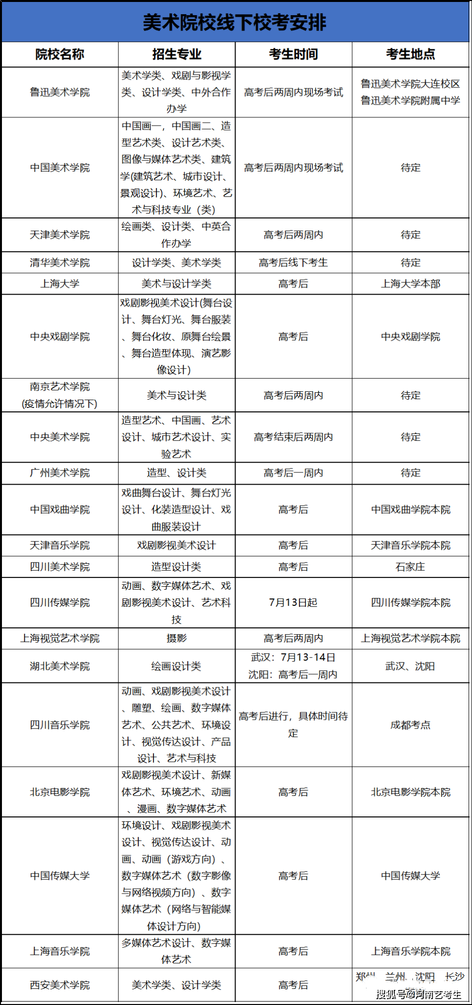 受疫情影响,不少美术院校都调整连校考方案或是视频考试,或是高考后校考院校美术专业一般采用以统考成绩进初选,高考后校考小编为各位考生和家长整理了各院校美术专业线下校考的时间地点安排,汇总成表:
