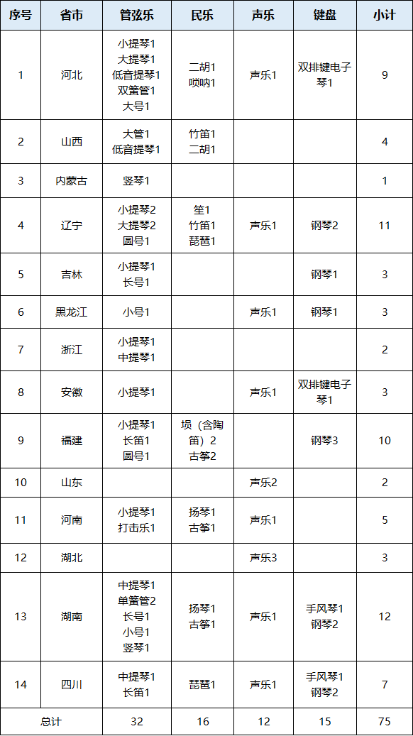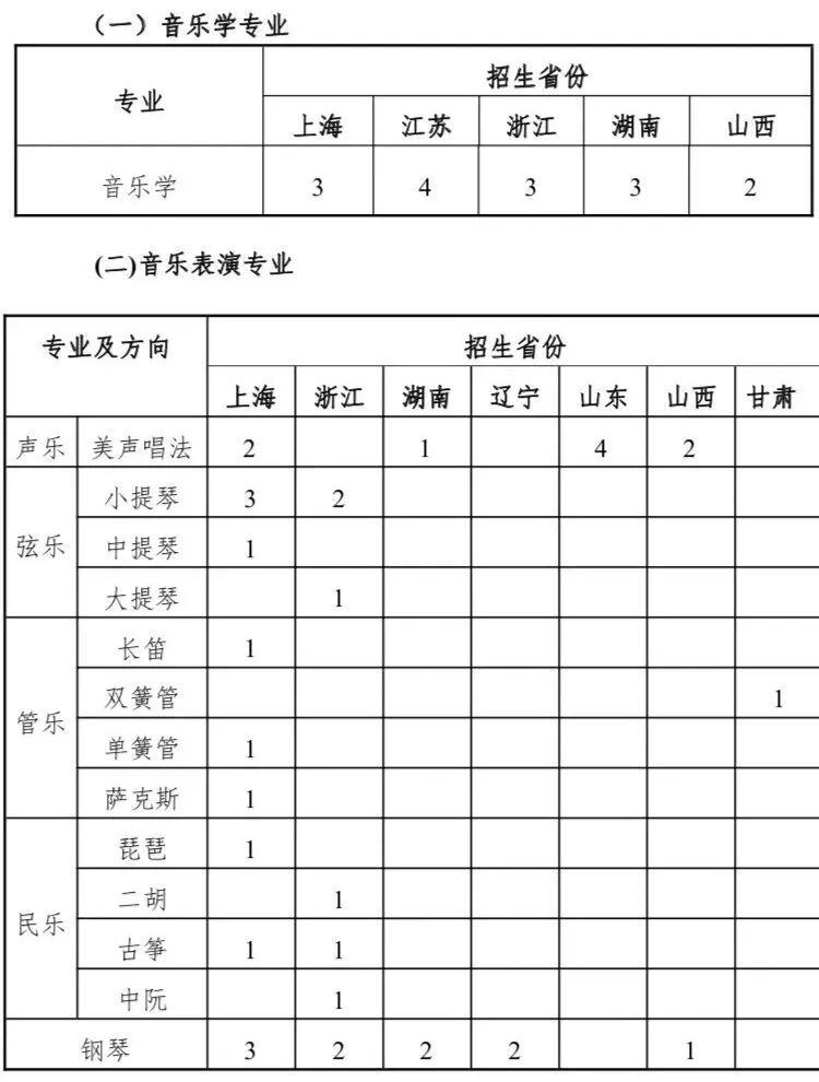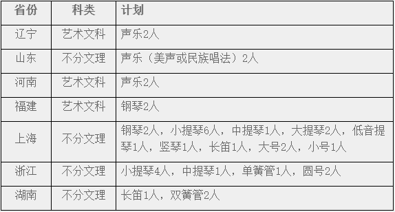 2020年音乐类面向黑龙江、吉林、辽宁、内蒙古、河北、山西、甘肃、四川计划招生62人。