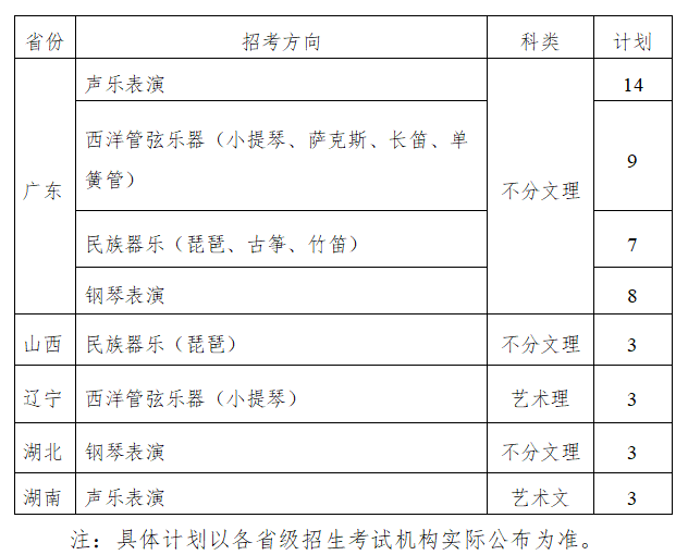 2020年音乐类专业使用省统考成绩录取,具体招生计划详以各省招生考试机构2020年招生计划表为准。