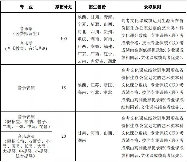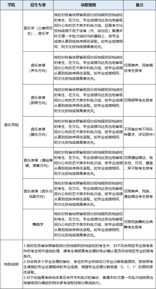 符合上述报考条件的考生方可报考我校,否则不予录取。报考我校的考生按各省招生文件规定的投档原则和投档比例予以投档。音乐表演(声乐)专业,进档考生按照主项声乐专业成绩从高分到低分择优录取;音乐表演(器乐)专业,进档考生按照主项为钢琴、萨克斯、手风琴的成绩从高分到低分择优录取(该专业计划不分方向,按照钢琴、萨克斯、手风琴三个器乐的成绩一道排序,择优录取)。各类排序成绩相同时,高考文化课成绩高的优先录取(含政策加分)。