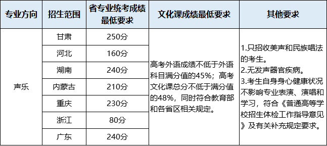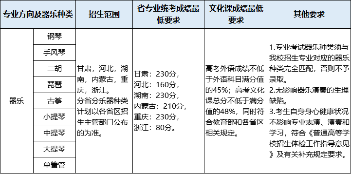 3、进档考生按照专业总分从高到低、声乐和器乐分别单独排序录取;如省级招生考试机构投档时,无法区分声乐和器乐,则合并声乐和器乐的招生计划,按照合并后的招生计划总量,以专业总分从高到低排序录取。如专业总分相同,再依次按照考生的文化课投档成绩、英语、语文、数学排序录取。对无法满足专业志愿的考生,按退档处理。