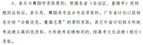 音乐、舞蹈类专业:文化和专业成绩达到所在省份最低录取控制分数线后,按统考(联考)专业成绩从高到低录取。专业成绩相同时,文化成绩高者优先。