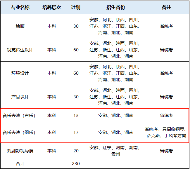 2020年音乐学专业招生计划为50人,其中湖北9人、湖南5人、广东4人、浙江5人、河南4人、河北4人、江苏4人、山西4人、安徽3人、重庆3人,四川3人,预留计划2人。