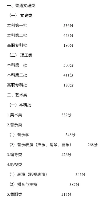 最低的是舞蹈类327分,比普通文科类本科第二批控制线526分低199分(低37.83%);其次是音乐类362分,比普通文科类本科第二批控制线526分低164分(低31.17%)。