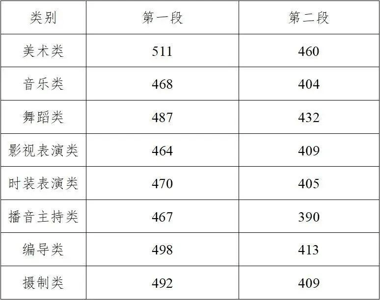 最低的第一段是影视表演类文化控制线464分比普通类第一段控制线594分低130分(21.88%),第二段是播音主持类390分比普通类495分低105分(低21.21%)。