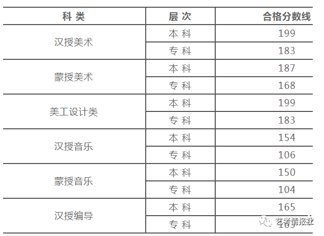 美术类:本科合格线总成绩180分且其中2门科目各不低于60分;高职(专科)合格线总成绩168分;