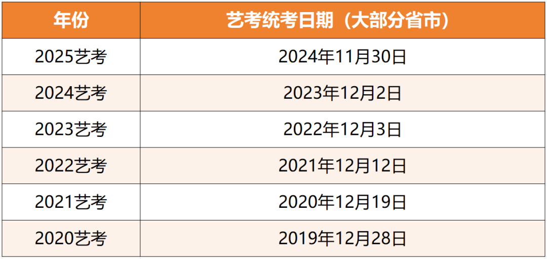 近年来,艺考统考时间逐渐提前,各省市艺考统考大多从2020年的12月下旬逐步提前至2025年的11月底,相较以往整体提前了约一个月。