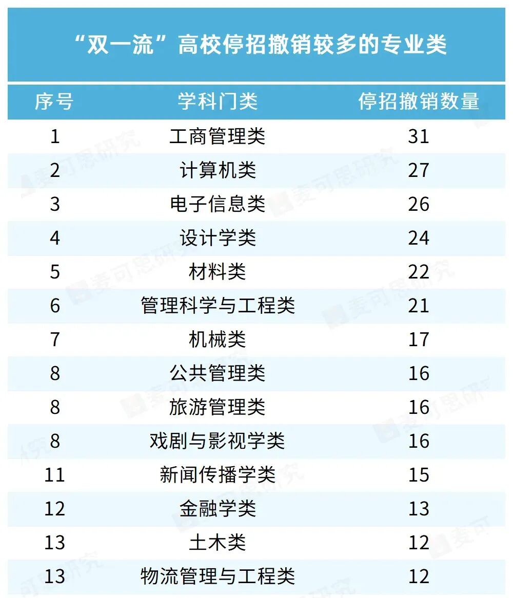 根据第三方教育咨询机构“麦可思研究”的不完全统计,有49所双一流高校停招、撤销专业478个。