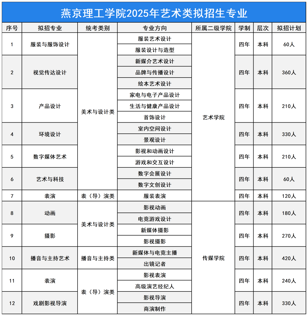 一 我们的学校 燕京理工学院是经教育部批准设立的全日制普通高等本科院校,其前身是中国优秀独立学院——北京化工大学北方学院。2013年经教育部批准转设为燕京理工学院,2016年入选河北省硕士学位授予立项建设单位,是河北省首批转型发展示范高校。学校设有63个本科专业及24个专科专业。 ▲“遇见”燕理 学校是“河北省示范性就业指导中心”“河北省优秀民办学校”“河北省大学生创业孵化示范园”“河北省园林式单位”,连续多年位居中国民办高校前列,多年被权威媒体和机构评为“品牌实力民办大学”“全国最具影响力民办大学”。学校已成为我国优秀的民办高校之一,正向着特色鲜明、国内一流、国际知名的综合性、创新型大学的目标前进。 01 区位优势得天独厚 学校位于京津冀协同发展先行示范区、北京城市副中心燕郊组团,距天安门仅38公里,坐拥北京城市副中心、国际环球影城的优质资源,环首都、京津冀、环渤海三大经济圈核心区位。学校置身政治、经济、文化沃土,美好生活社区建设持续推进,校园体验与众不同,培育了学生更加广阔和开放的视野,校园文化活力全面释放,四川震区支教支农、感恩教育、千人进社区成为省内外有影响力的品牌教育活动,国际大学生时尚设计盛典成为具有全球影响力和权威性的时尚设计类专业赛事。 02 国际氛围高端浓郁 学校邀请世界政要领袖、学术大咖在燕理国际课堂开讲,学生通过世界青年领导力论坛与国际级大师对话人生与未来。诺贝尔经济学奖获得者埃里克·马斯金教授特聘成为学生们的学业导师,联合国副秘书长娜塔莉亚·卡内姆博士亲临现场选拔优秀学子,助力学生登上国际舞台,优秀学子杨与真、刘炼、李丹阳以中国青年大学生身份在世界舞台发声。 03 教育通道多元开放 学校构建了国内“产学研协同”和国外“优质教育资源共享”的双循环格局,坚持满足学生高层次求学的个性化需求。坚持走产教融合、协同育人之路,一方面充分发挥学校和企业两个育人主体的作用,另一方面搭建国际交流平台,积极开展对外人才培养、学术、科技和文化交流,让学生享受到世界优质教育资源的哺育。先后与北美、亚洲、欧洲多所国际知名高校建立了合作关系,特别投资建设了“微留学”学习基地,为学生开设了海外深造定向培养项目,给学生提供进入世界名校深造的机会。 04 应用人才立交培养 学校不断丰富完善办学层次,强化办学优势,凝练办学特色,全面构建起“学历教育、继续教育、国际教育”相互融合,“专科—本科—研究生”立交培养的高质量人才体系,为学生打通专本硕、国内外纵横多向的人生发展通道,铺就释放生命无限能量,实现人生无限可能的广阔舞台。 二 我们的计划 注: 1、学费以相关部门最终批复为准,招生专业及计划以当地教育部门公布为准。 2、我校所有专业均设有中外本硕连读培养方向,学生可申请就读,详情咨询学校招生办公室。 三 我们的分数 四 我们的专业 01 服装与服饰设计专业 本专业下设服装艺术设计方向、服装设计与造型方向,依托时尚产业进行特色人才培养。培养具有服装设计、人物形象设计、时尚摄影、时尚营销等知识的应用型人才,能够在服装设计、化妆造型、时尚传媒、时尚搭配等领域从事相关工作。 02 视觉传达设计专业 本专业为河北省一流本科专业,下设品牌与传播设计、新媒介艺术设计、绘本艺术设计方向。通过专业、教师、学生三级工作室开展实践教学,紧跟世界潮流,注重国际视野与创新思维,结合竞赛、工作室多维度培养人才,能够在影视后期制作、频道包装、品牌策划创意、绘本设计等领域从事相关设计工作。 03 产品设计专业 本专业为河北省一流本科专业,设有生活与健康产品设计、家电与电子产品设计两个方向,注重培养具备艺术修养、系统思维、创新设计能力和国际化视野的高素质应用型人才。学生毕业后可从事用户研究、产品策划、产品造型设计、产品运营、产品经理等岗位,为产业链各环节提供全方位支持,满足市场对跨领域设计人才的需求。 04 环境设计专业 本专业下设室内设计和景观设计两个方向,培养具有环境设计专业基础理论和专业技能、具有创新思维和实践能力的应用型人才,能够将创新理念、数字化技术、规划策略整合思考并进行综合实践。毕业后在室内陈设设计、景观规划设计、施工管理等领域从事相关设计工作。 05 数字媒体艺术专业 本专业下设影视动画创作方向、游戏和交互设计方向,培养具有数字媒体艺术专业的理论知识和创新设计能力的应用型人才。探索数字影像、数字游戏、数字交互等多领域交叉的复合化数字化设计和创作,学生毕业后可以在相应公司担任游戏策划师、短视频创作、自媒体运营、交互设计师等工作岗位。 06 艺术与科技专业 本专业下设数字展陈设计方向、数字文创设计方向,培养具有艺术与科技领域交叉融合的理论知识和创新设计能力的应用型人才,能够在交互设计、数字展陈设计、数字文创设计等领域从事相关工作。 07 表演(服装表演)专业 本专业下设服装表演方向,培养具有扎实表演基础理论、较高的艺术修养、良好的职业道德、服装服饰表演能力、表演编导能力的应用型人才,能够从事服装表演、编导策划、时尚传播等工作。 08 动画专业 本专业培养