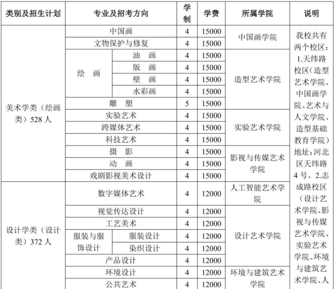 七、学费和待遇:我校录取新生的学杂费和在学期间的待遇,均按国家有关规定办理。1.学生应按照规定每年按时缴纳学费,未经学校批准,学生不得拖欠学费、住宿费,否则按国家及学校有关规定处理,天津市内六区新生(以高考报名地为准)原则上不提供住宿。教材及住宿等其他费用,详见录取通知书。2.我校实行学年奖助学金和助学贷款相结合的办法。特困家庭学生按规定可申请助学贷款,鼓励学生在生源地申请助学贷款。3.由于美术院校学费较高,请考生报考时考虑自身经济承受能力,慎重报考。